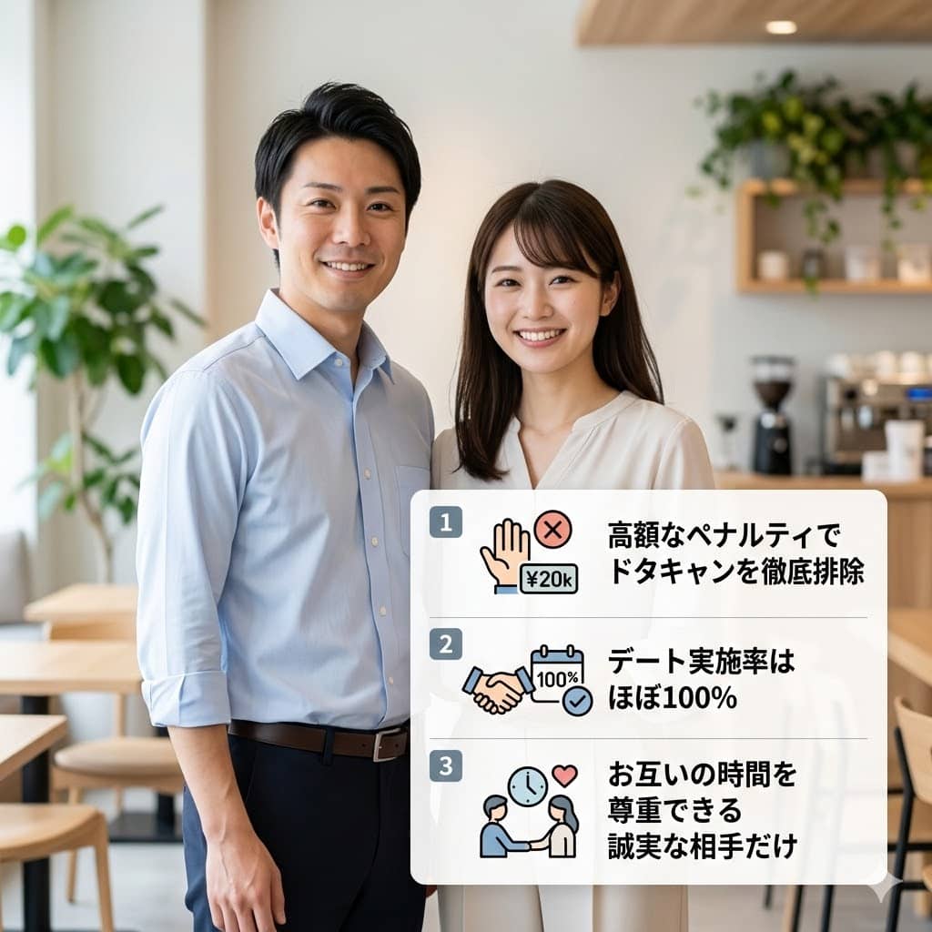 デート当日の無断キャンセル(ドタキャン)を防ぐための、厳格なキャンセルポリシーも重要な特徴です。