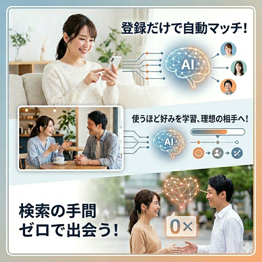 自分で検索して選ぶ手間が省けるだけでなく、外見など一部の条件だけで判断してしまう偏りを防ぎ、客観的なデータに基づいた相性の良い相手との出会いを実現します。