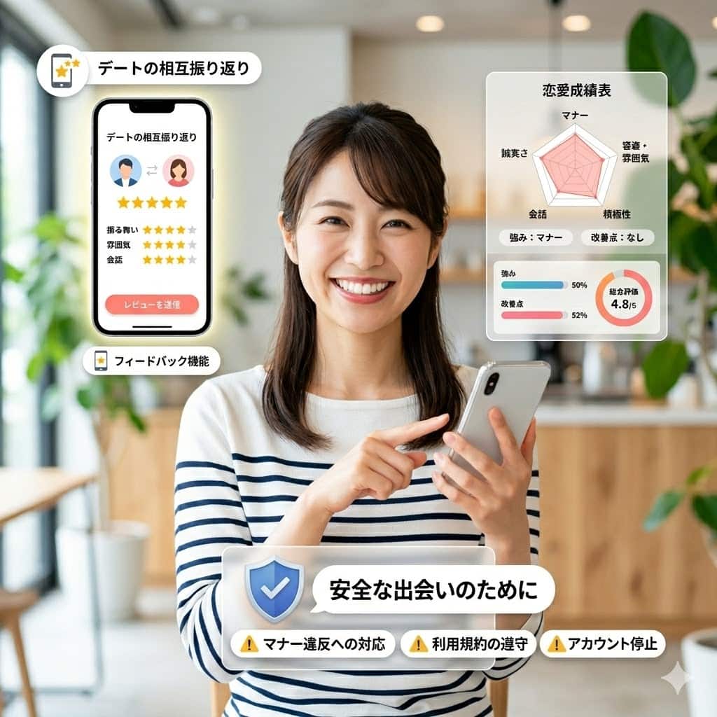 お互いが「評価されている」という適度な緊張感を持つことで、初対面でも礼儀正しい振る舞いが促進され、安全で不快感の少ない高品質なデート体験が担保されているのです。